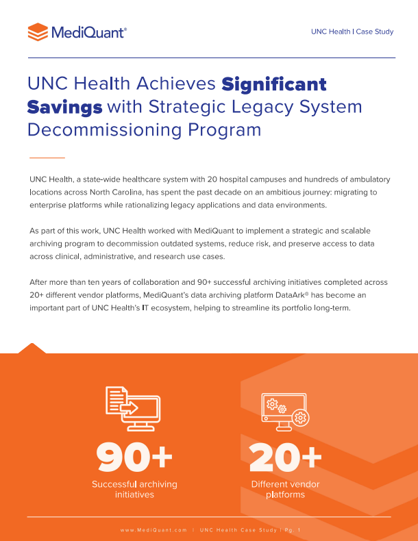 UNC Health successfully completed over 90 archival initiatives using MediQuant’s DataArk platform, spanning more than 20 different HIT vendor systems, including Allscripts, GE, McKesson, MEDITECH, NextGen, and Siemens/Cerner. This effort resulted in significant cost reductions, improved security by decommissioning outdated platforms with limited patching or visibility, and enhanced operational efficiency for HIM, revenue cycle, and clinical staff, who now access archived data through a single interface. Archiving has become a seamless, low-friction part of UNC Health’s IT lifecycle, enabling smoother operations. Most importantly, MediQuant’s solution supported large-scale application rationalization by reducing complexity, minimizing training needs, and allowing teams to focus on core systems.